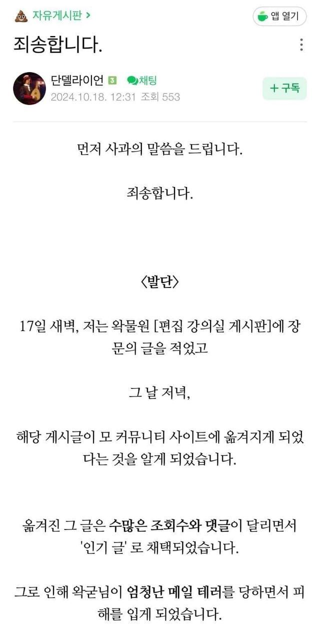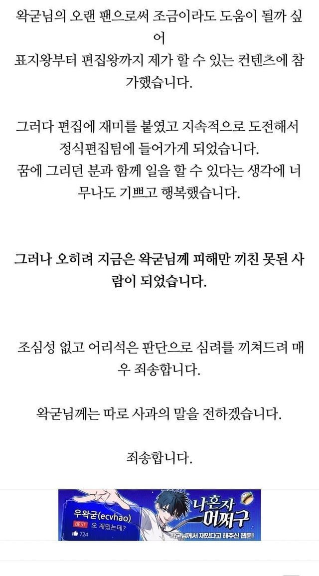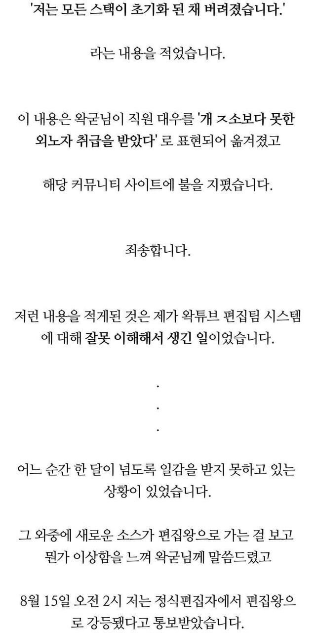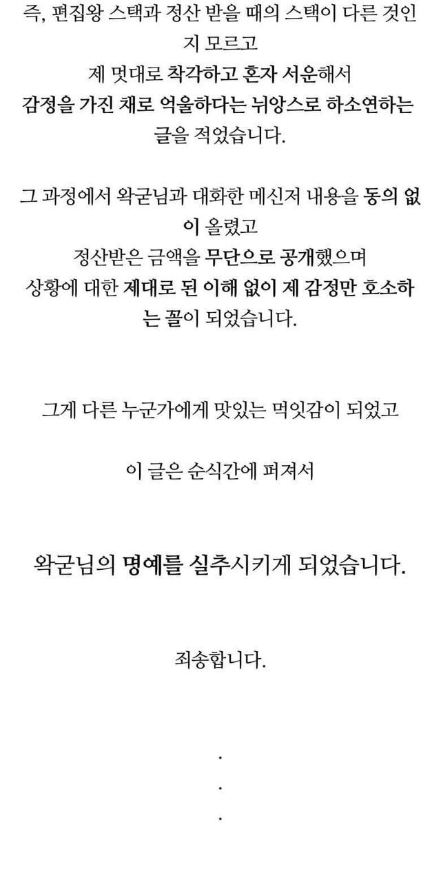 노예인거 까발려서 교1주님 욕먹게 해서 죄송하다고 사과문 올림