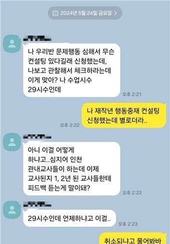 아울러 학부모들의 민원에 시달린 정황도 드러났다. A교사는 “교사가 아파트 단지 안에 들어와서 등교지도 해달라시는데 학교에서 그렇게 해줘야 한다고 하네” 등 내용의 메시지를 동료에게 전달했다.