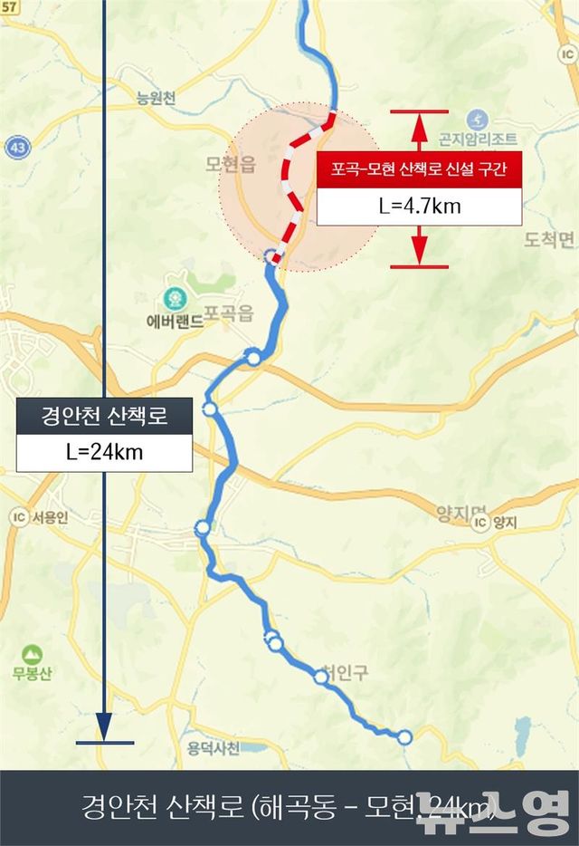포곡읍 유운리 유운교부터 모현읍 왕산리 왕산교까지 경안천 주변 4.7km 구간에 산책로를 조성하는 사업은 민선8기 이상일 시장의 공약이다. 시는 2021년 8월부터 이 구간을 1~4구간으로 나눠 사업을 추진해 왔는데, 이번에 마지막 구간까지 완공해 연내 전 구간을 연결한다는 목표를 조기에 달성했다.