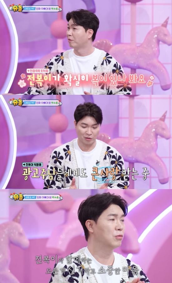 이날 박수홍은 "전복이(태명)가 확실히 복이 있다. 자랑해도 되냐. 이렇게 광고가 많이 들어온 게 처음이다. 복덩어리"라면서 웃음을 감추지 못했다.