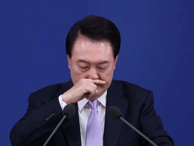 윤석열 대통령이 7일 서울 용산 대통령실 청사 브리핑실에서 대국민담화 발표를 마친 후 취재진 질문을 받고 있다. / 뉴스1