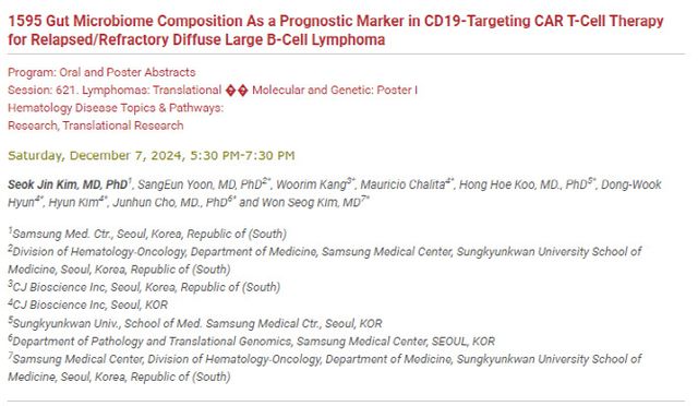 7일 미국 혈액학회(ASH 2024)에 공개된 초록에 따르면, CJ바이오사이언스는 ‘Gut Microbiome Composition As a Prognostic Marker in CD19-Targeting CAR T-Cell Therapy for Relapsed/Refractory Diffuse Large B-Cell Lymphoma’란 제목으로 연구결과를 발표한다.