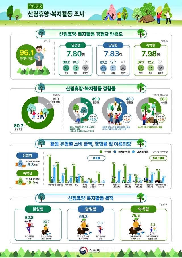 또 응답자의 96.1%가 산림휴양·복지활동이 삶에 긍정적인 영향을 미친다고 인식했다.