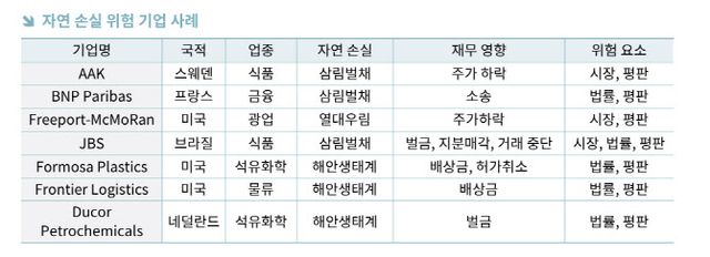 한편 자연자본 관리 대처가 미흡해 경제적 피해를 겪는 기업들도 생겨나고 있다. 보고서에 따르면 자연자본 관리 소홀로 주가 하락, 소송 피해, 벌금 부담 등 다양한 재무적 피해를 겪는 기업들이 발생하고 있는 것으로 나타났다. 특히 자연자본을 직접 활용해 제품화하는 수산업, 임업이나 식품 업종은 물론 금융이나 운송 등 서비스 업종까지 다양한 업종의 기업이 자연자본 관리 소홀에 따른 재무적 위험에 직면할 수 있다고 보고서는 지적했다.