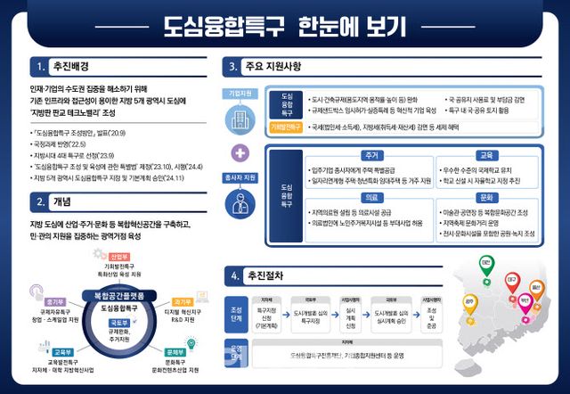 도심융합특구는 지방 대도시 도심에 산업·주거·문화 등 복합혁신공간을 조성하고, 범부처의 기업지원 사업을 집중시켜 기업투자와 청년 일자리 창출을 견인하는 광역 성장거점 사업이다.