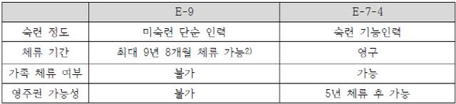 E-9 비자를 받아 한국에 들어온 비숙련 외국인 근로자들은 최대 9년 8개월 체류할 수 있지만 영주권 획득이 원천적으로 불가능하다. 숙련 비자(E-7-4)가 체류 기간을 정하지 않고, 5년 체류 후 영주권 획득 자격을 부여하는 것과 대조적이다. E-9 인력은 여기에 가족 체류도 금지하고 있다.