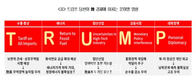 대한상의는 “트럼프 당선은 수출과 통상, 에너지, 첨단산업, 금융시장, 대북정책 등 우리 경제 전방위에 큰 영향을 미칠 것”이라고 분석했다. △보편적 관세 도입(Tariff on All Imports) △화석연료 부활(Return to Fossil Fuel) △첨단산업 불확실성 증가(Uncertainties in High-Tech Industry) △통화정책 개입(Monetary Policy Interference) △북-미 정상간 개인 외교(Personal Diplomacy)에 대한 사전 준비를 촉구했다.