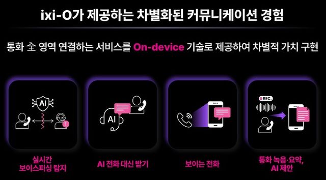이날 공개된 익시오는 LG유플러스가 자체 개발한 AI 통화 서비스로 △전화 대신 받기 △보이는 전화 △실시간 보이스피싱 감지 △통화 녹음 및 요약 기능 등을 온디바이스 환경에서 제공한다.