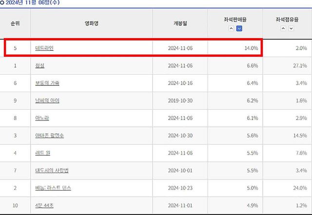 '데드라인' 개봉 첫날인 6일 박스오피스 좌석판매율 순위. / 영화관입장권통합전산망