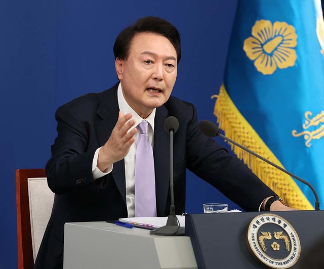 윤석열 대통령이 7일 서울 용산 대통령실 청사 브리핑실에서 열린 대국민담화 및 기자회견에서 취재진의 질문에 답하고 있다. / 뉴스1
