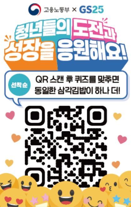 [와이뉴스] 고용노동부와 지에스25 편의점이 협업하여 11월 한 달간 청년의 내일을 응원한다. 전국 지에스25 편의점 삼각김밥에 청년도전지원사업과 청년성장프로젝트 홍보 스티커를 부착하고, 청년 3,333명에게 삼각김밥을 무료(기프티콘)로 제공하는 퀴즈 이벤트도 실시한다.