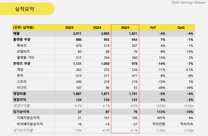 콘텐츠 부문 내 뮤직 매출액은 전년 동기보다 8% 감소한 4709억원을 기록했다. 스토리 매출액은 2187억원으로, 전년 동기 대비 12% 줄었다.