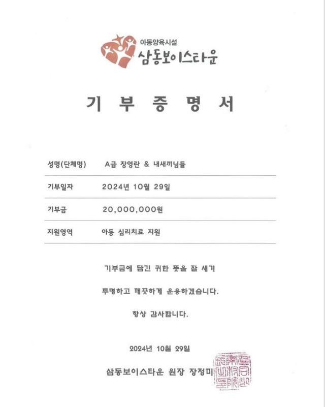 또한 "삼동보이스타운 화이팅. 에이급장영란 화이팅. 영라뉴화이팅"이라고도 덧붙였다.