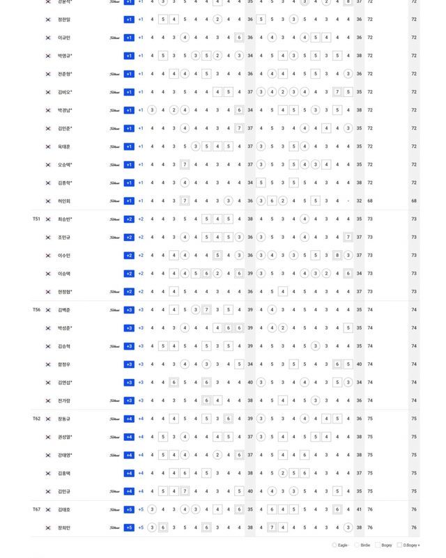 T1.송민혁-이동민-박은신 -5, T4.이대한-김동민-이형준-이정환 -4, T8.황중곤-배용준-이태훈-이상희-정재현-장유빈 -3, T14.김찬우-최진호-유송규-조우영 -2, T20.한승수-이태희-김한별-강경남 -1, T26.김우현-문도엽 E, T33.윤상필-임예택-문경준-신용구-박상현-김영수-김비오-옥태훈-허인회 +1, T51.최승빈-이수민-이승택 +2, T56.김백준-김승혁-함정우 +3, T62.김홍택-김민규 +4, T67.장희민 +5.