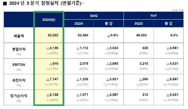 매출은 5조2002억원으로 작년 동기 대비 5.6% 증가했다. 순손실은 5138억원으로 적자로 돌아섰다.