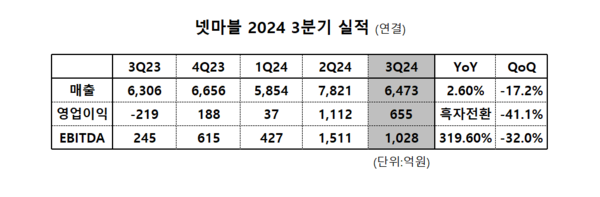 [딜사이트경제TV 황재희 기자] 넷마블이 올 3분기 655억원의 영업이익을 내며 흑자 전환에 성공했다. 다만 전 분기와 비교해선 매출과 영업이익이 두자릿수로 감소하며 실적이 소폭 후퇴하는 모습을 보였다.