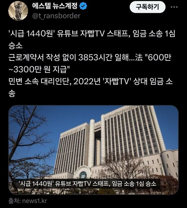 15명이 자빱TV 운영자 이 모 씨를 상대로 낸 임금 청구 소송에서 프리랜서가 아닌 근로자로 인정해서 1심에서 승소함