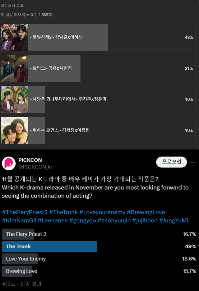 최근 픽콘이 공식 유튜브 채널과 X(구 트위터)를 통해 '11월 공개되는 K드라마 중 배우 케미가 가장 기대되는 작품은?'이라는 주제로 투표를 진행했다. 10월 31일부터 11월 7일까지 진행된 이번 조사에는 총 1,687명(유튜브 커뮤니티 1,585명, X 102명)의 네티즌이 참여했다.
