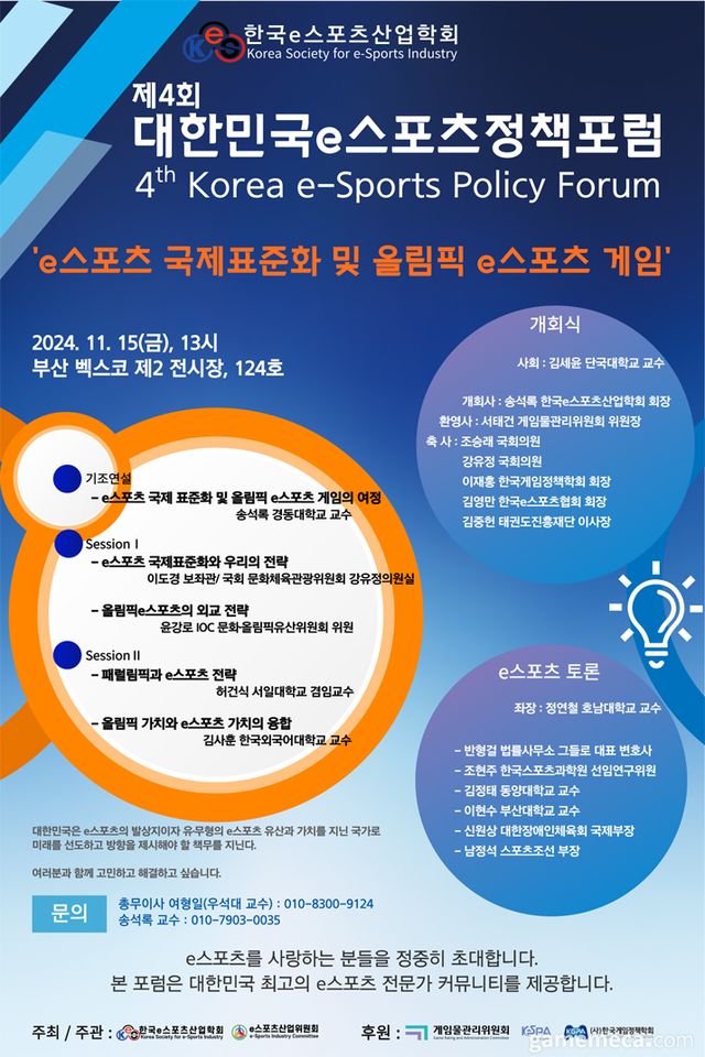 제4회 대한민국e스포츠정책포럼이 지스타 기간인 11월 15일 오후 1시에 벡스코 제2전시관 124호에서 개최된다.