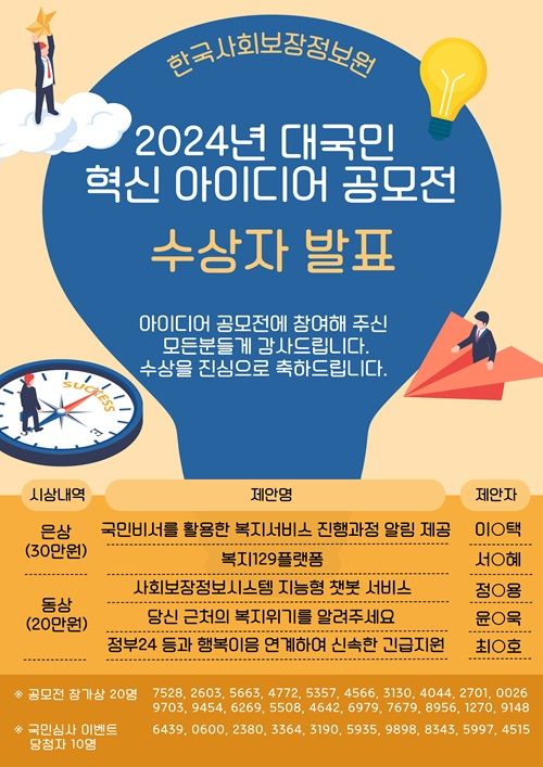 한국사회보장정보원은 7월 22일부터 4주간 진행한 ‘2024년 대국민 혁신 아이디어 공모전’ 결과를 발표했다고 전했다.