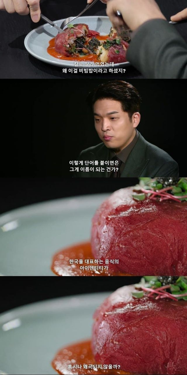 모수는 미국에서부터 쭉 전통 한식 재료를 접목시킨 “한식” 파인다이닝 레스토랑- “이걸 튀기셨어요?”- “(요리 중 백대표님과 얘기하면서) 회덮밥인가 했는데 그건 또 아니었다.”라고 여러 차례 물어봤음안성재야말로 미국 이민자 당사자이고, 또 이미 일식을 배운 바가 있었기 때문에튀긴 주먹밥을 감싼 날참치(+미국에서 낸 버전에선 와사비 날치알)의 일식 조합에 비빔밥의 이름표를 다는 것이 위험할 수도 있다고 판단, 비빔밥의 왜곡을 염려한 것단순히 에드워드의 인생요리 주제를 이해 못하고 “비비지 않았으니 비빔밥이 아니다”라고 나온 심사인 것만은 아님