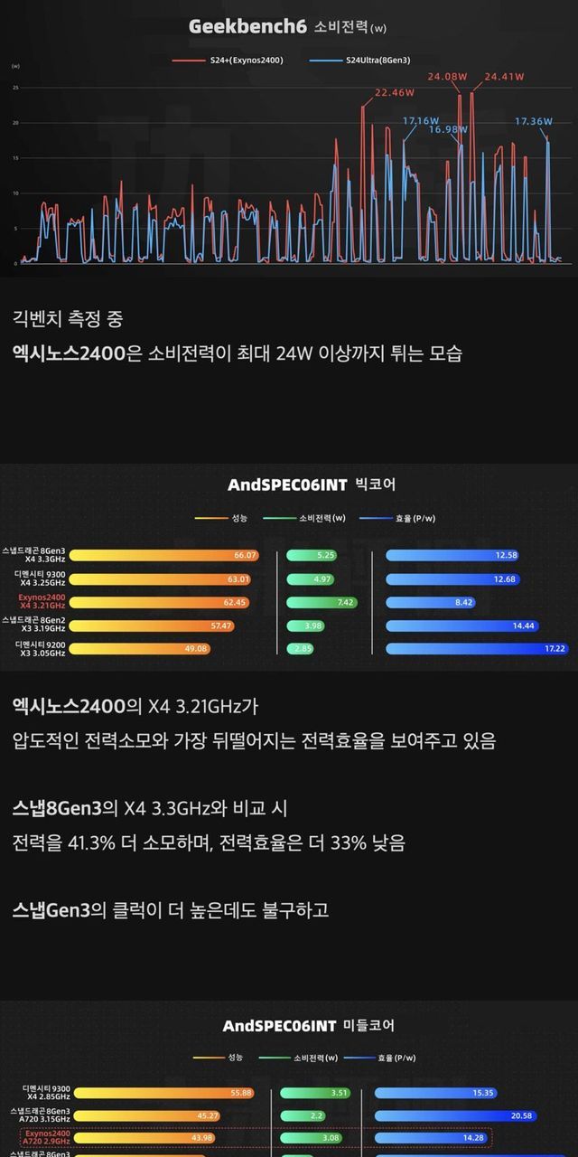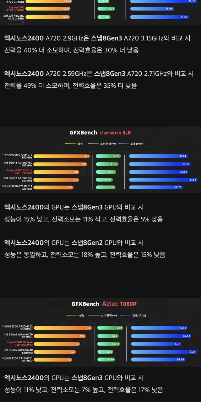 삼성전자 “갤럭시 S24 시리즈의 엑시노스2400 사용 모델과 스냅드래곤8Gen3 사용 모델은 성능 차이가 없다”오늘 국회에서 이루어진 국정감사에서 삼성전자가 밝힌 입장이다과연 정말로 둘은 성능이 별 차이가 없는 걸까?알 만한 사람들은 저게 거짓말이라는 걸 이미 알고 있겠지만 그래도 이번 기회에 다시 확인사살을 해보자리뷰 출처: 쌀리뷰CPU 벤치마크, GPU 벤치마크, 배터리 소모 테스트 모두에서 엑시노스 탑재 모델이 처참하게 밀린다리뷰 출처: 테크노사우루스원신 게이밍 테스트 기준으로도 엑시노스가 스냅드래곤에게 압도적으로 밀린다리뷰 출처: 쌀리뷰붕괴 스타레일 게이밍 테스트 기준으로도 엑시노스의 성능이 매우매우 처참하다는 게 바로 눈에 보인다나중엔 지 혼자 10fps대까지 떨어진다 ㄷㄷㄷ결론)삼성의 주장은 거짓이며 실제로는 엑시노스 모델과 스냅드래곤 모델의 성능 차이가 매우매우 크다삼성은 국정감사에서까지 거짓말을 당당하게 하는 거짓이 몸에 밴 기업이다
