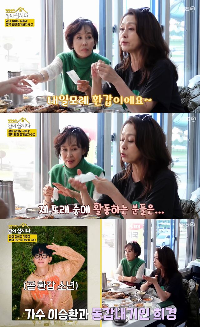이어 문희경은 "또래 중 활동하는 분들 중에 가수 이승환이 있다. 친구다"고 덧붙였다. 이를 듣던 혜은이는 "환갑은 어디 가서 이야기도 못해"라고 하자 박원숙 역시 "환갑은 기저귀 겨우 뗀 수준이다"고 말해 웃음을 자아냈다.