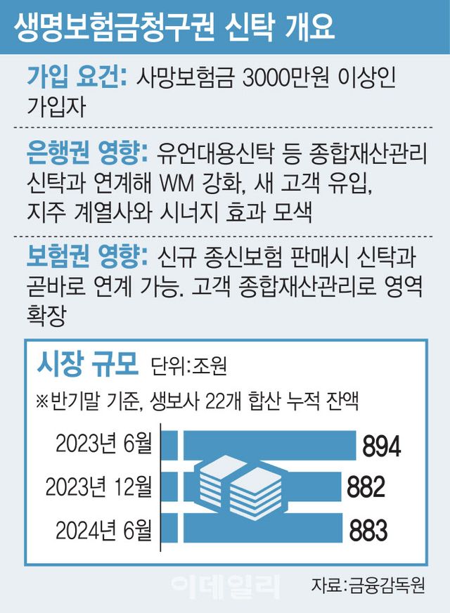 생명보험금청구권 신탁은 고객과 금융사에 모두 도움이 될 수 있다. 고객들은 자신의 뜻대로 사망보험금이 집행되도록 설계해 보험금을 둘러싼 각종 분쟁을 막을 수 있다. 금융사는 새로운 고객을 늘리고 다른 자산관리 분야와 연계해 수수료수익도 창출할 수 있다. 금융감독원에 따르면 사망 담보 보험금 규모는 생보사 22개 합산 기준 약 883조원이다. 은행 관계자는 “시장 규모 자체가 크고 새로운 사업 분야이기 때문에 자산을 적극적으로 유치하려 한다”며 “당장 관리·수수료 수익으로 이어지지 않을 수 있지만 성장 잠재력이 있다고 판단해 은행들이 서비스 준비를 하고 있다”고 말했다.