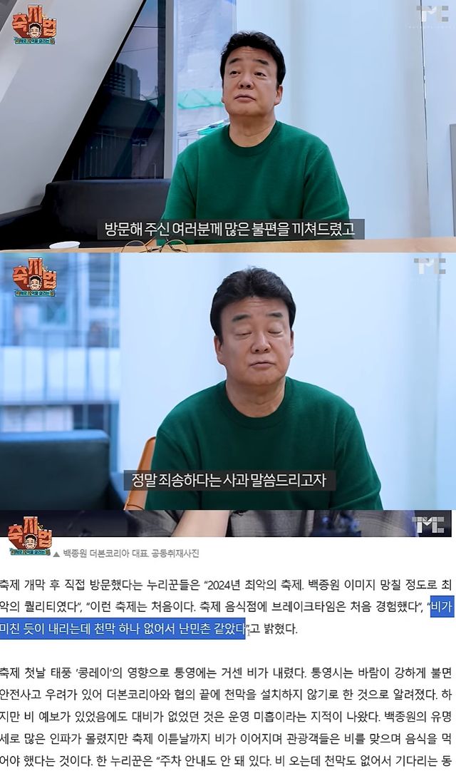 백종원은 "이번 축제에 좋은 마음으로 응원의 마음을 가지고 와주신 분들께 고마움을 다시 한번 말씀드린다. 그에 못지 않게 고마움보다 훨씬 더 크게 죄송한 마음 드린다. 다음번에는 철저하게 준비해서 새로운 모습으로 인사드리겠다"며 사과의 뜻을 전했다.