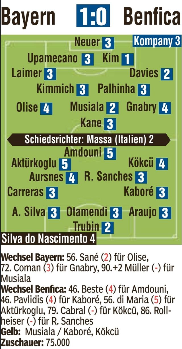 뮌헨은 벤피카의 백5 맞춤 전술에 크게 고전했지만, 후반 22분 터진 자말 무시알라의 결승 골로 1-0으로 승리했다. 뮌헨은 앞서 원정 경기 2연패에서 벗어나 승점 3점을 챙겨 17위(2승 2패·승점 6)로 올라섰다.