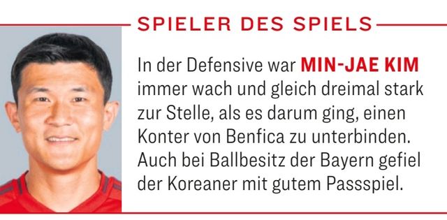 김민재는 드물게 올라오는 벤피카의 역습을 차단하는 철벽 수비를 선보였다. 김민재를 비롯해 뮌헨 수비진은 벤피카를 슈팅 1개로 꽁꽁 묶었다. 수비에 막힌 슈팅이 5개에 달할 만큼 벤피카의 공격을 틀어막아 완벽한 승리를 따냈다.