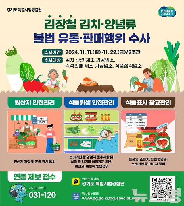 기이도 경기도 특별사법경찰단장은 “김장철 성수식품 집중수사를 통해 도민이 안심할 수 있는 먹거리 환경을 조성을 위해 최선을 다하겠다”면서 “식품안전에 위협이 될 수 있는 불법행위에 대해서는 관련 법령에 따라 강력하게 처벌할 방침”이라고 말했다.