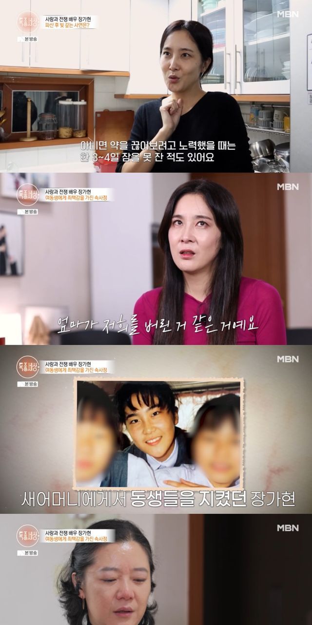 장가현은 집에 돌아오자마자 약을 찾아 눈길을 끈다. 이혼 이후 증상이 심해졌다는 그는 "수면장애가 심해 약을 먹어도 잠을 못 잘 때가 있다. 해 뜨고 간신히 한 두시간 잔다. 약 끊어보려고 노력할 땐 3~4일을 못 잤다"고 고백했다.