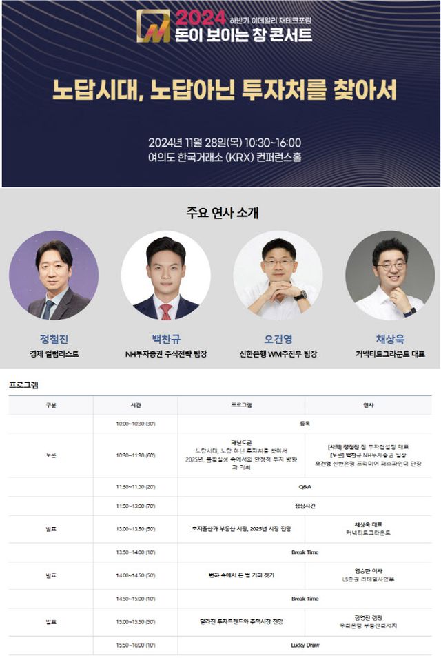 이데일리가 여러분의 투자 불확실성을 한 방에 날려버리기 위해 자리를 마련합니다. 주식과 환율, 부동산 이외에도 한 푼이라도 더 벌 수 있는 투자 노하우를 알려 드리겠습니다. 전문가들과 함께 안갯속 투자시대를 속 시원하게 뚫어 드리겠습니다. 이데일리 돈이 보이는 창 콘서트에 많은 관심 부탁드립니다.