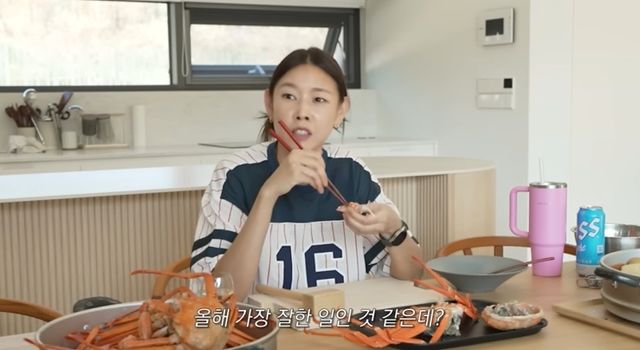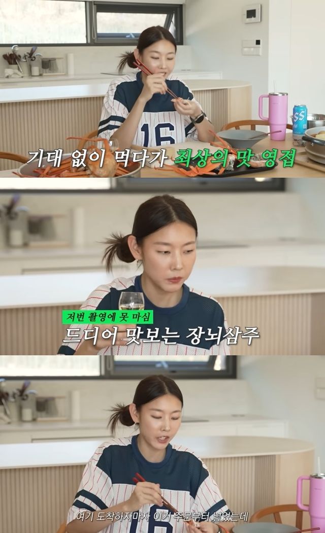 공개된 영상에서 한혜진은 홍천 별장을 찾아 홍게를 비롯해 해산물 먹방을 펼쳤다.