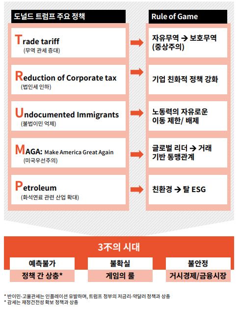 먼저 트럼프 행정부 2기의 주요 정책 기조는 △무역관세 증대(Trade tariff) △법인세 인하(Reduction of corporate tax) △불법이민 억제(Undocumented Immigrants) △미국우선주의(MAGA·Make America Great Again) △화석연료 관련 산업 확대(Petroleum) 등 트럼프를 뜻하는 다섯 가지 키워드로 요약된다.