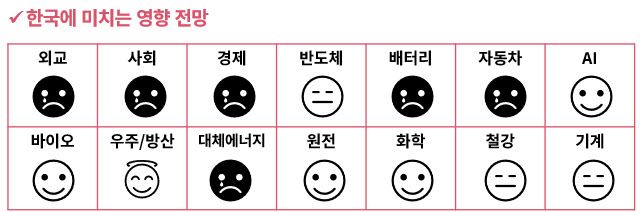 반면 동맹국 간의 안보 동맹 약화로 각국의 국방비가 늘어나고, 우주산업의 우위를 선점하는 정책이 적극적으로 추진되면 국내 기업엔 미국 우주산업에 진출할 기회가 커질 것으로 보인다. 또 바이든 정부의 인공지능(AI) 행정명령이 폐지되는 등 빅테크 기업에 대한 규제가 완화되면 고성능 AI 기술을 확보한 국내 기업도 반사이익을 누릴 수 있다.