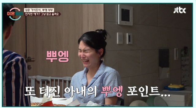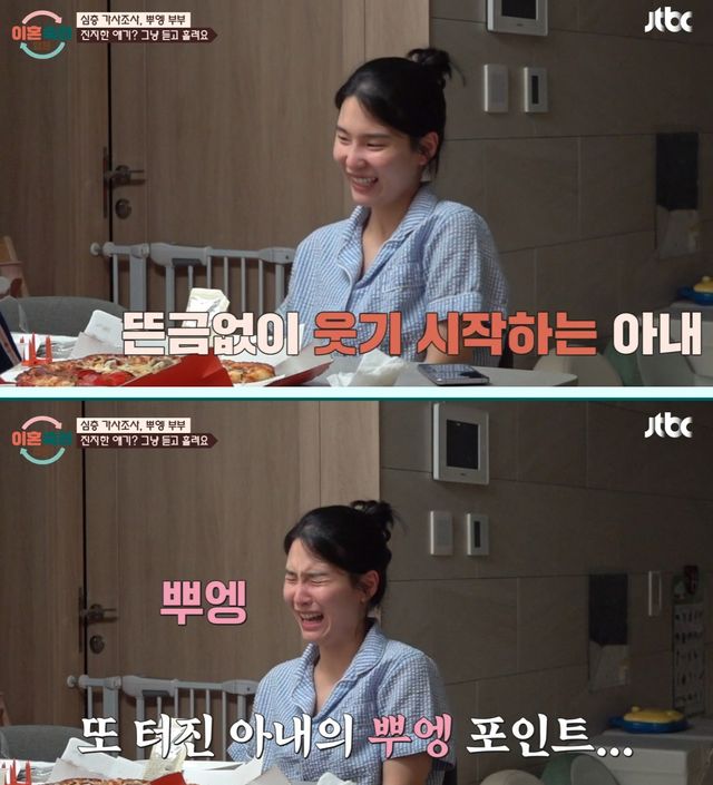 하지만 갈등 상황을 버티지 못하는 아내는 아기 같은 말투로 남편과 대화할 뿐만 아니라 뜬금없이 웃다가 갑자기 '뿌엥'하고 울어버려 이를 지켜본 MC들도 모두 황당함을 표했다.