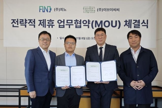 리빈 피노 대표이사(왼쪽에서 2번째), 최정우 이브이씨씨 대표이사(왼쪽에서 3번째). ⓒ 피노