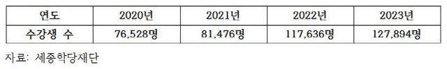 세종학당은 문화체육관광부 산하 공공기관으로 외국인들에게 한국어 교육과 한국문화 소통 및 교류를 위해 설립한 기관이다. 올 6 월 기준 88개국 256개소를 운영 중이며, 2027 년까지 300개소 확대할 계획이다. 2023년 세종학당 수강생 수는 총 12만7894명으로 전년 대비 8.7% 늘었다.