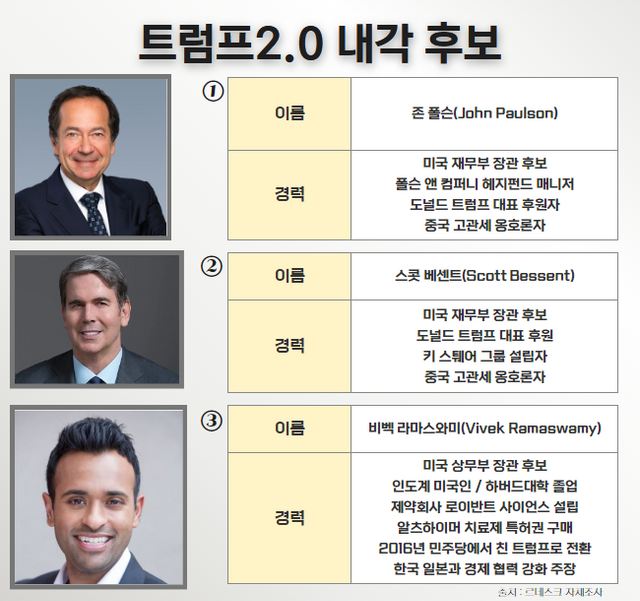 가장 먼저 눈여겨봐야 할 인물은 존 폴슨(John Paulson)과 스콧 베센트(Scott Bessent)다. 두 인물 모두 트럼프의 핵심 충성파 인물들로 미국 재정을 담당하는 재무부 내각 후보로 거론되고 있다. 폴슨은 미국의 억만장자 헤지펀드 매니저로 폴슨 앤 코퍼레이션을 이끌고 있다. 트럼프의 '큰 손' 기부자 중 한 명으로 10년 넘게 관계를 유지하고 있다. 흥미로운 점은 중국과의 디커플링을 반대했다는 점이다.