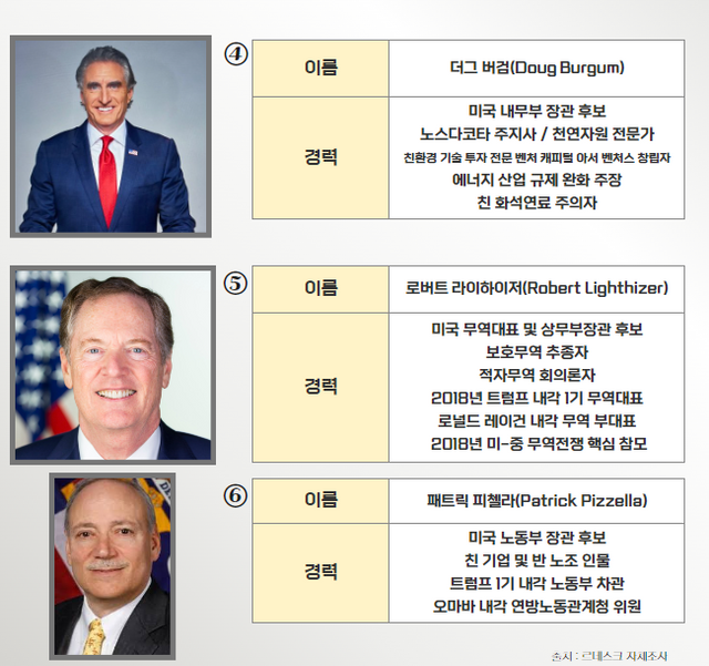 전문가들은 트럼프만큼이나 내각 인물들을 주시할 필요가 있다고 말한다. 재계관계자는 "무역대표나 상무부, 재무부 장관 등은 트럼프만큼 국내 산업계에 영향력을 행사할 수 있다"고 설명했다.