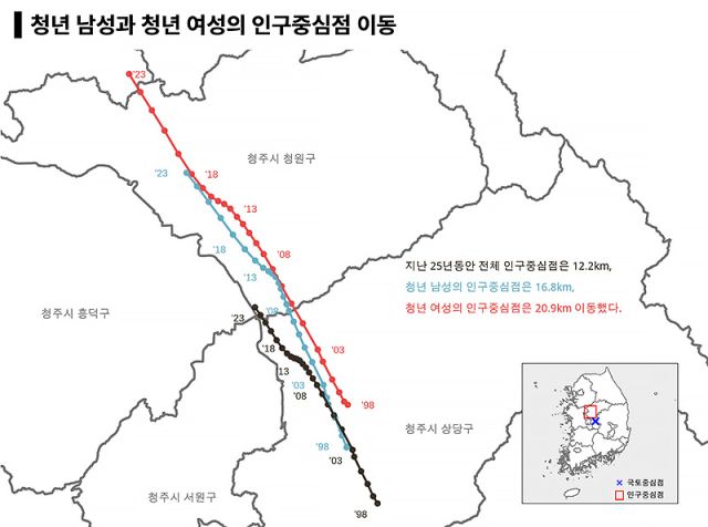 1998년 당시 청년 남성과 여성의 인구중심점 사이의 거리는 약 2km였는데, 2000년대 중반부터 점점 늘어나 2023년에는 약 6km까지 벌어졌다. 같은 기간 전체 남녀 간 인구중심점 거리가 1km 이내로 유지된 것과 대조적이다.