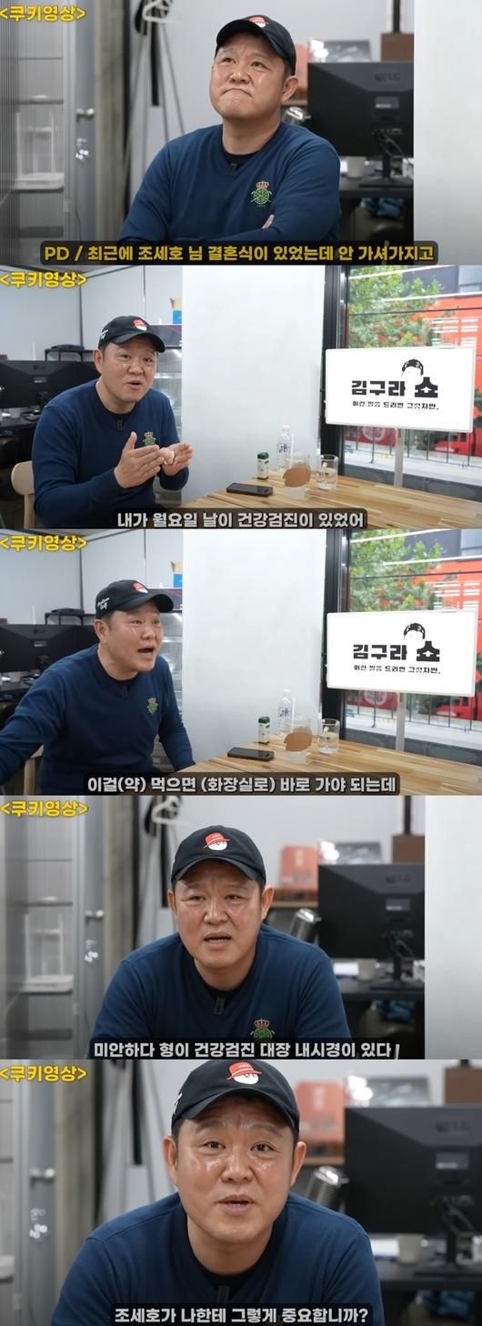 김구라는 “조세호 결혼식 날짜를 받은 건 한두 달 전이었고, 건강검진도 같은 시기에 예약했다”며 “결혼식이 일요일, 건강검진이 월요일이어서 어쩔 수 없이 불참하게 됐다”고 설명했다.