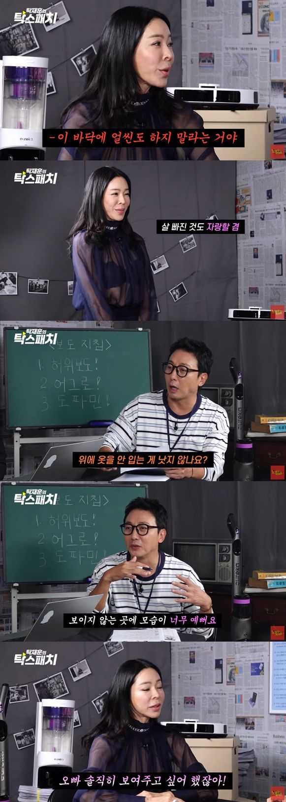 탁재훈이 "그럴 거면 위에 안 입는 게 낫지 않냐"고 이야기하자 "아직도 내가 여자로 느껴지나 봐?"라고 대응해 웃음을 자아냈다.