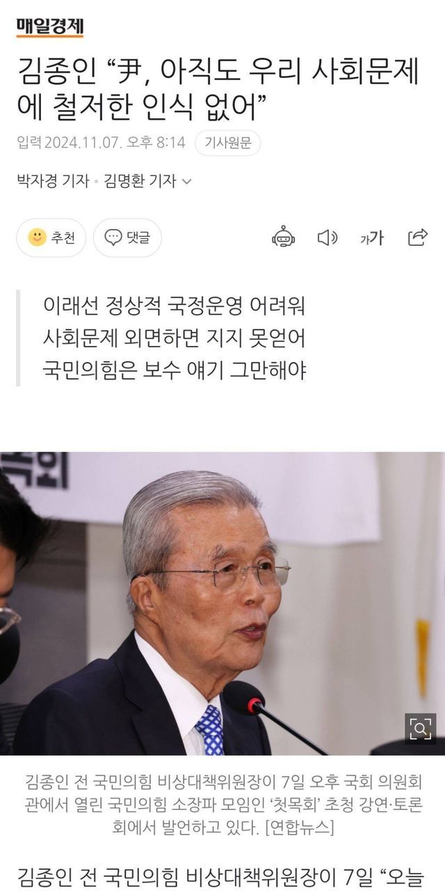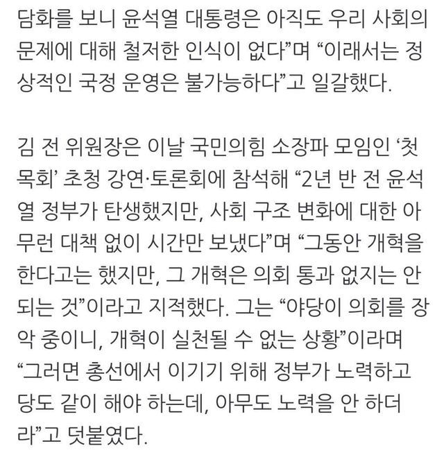 이래선 정상적 국정운영 어려워 사회문제 외면하면 지지 못얻어 국민의힘은 보수 얘기 그만해야 김종인 전 국민의힘 비상대책위원장이 7일 “오늘 담화를 보니 윤석열 대통령은 아직도 우리 사