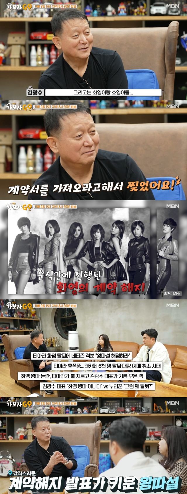 김광수는 "너무 기가 막히더라. 너무 화가 나서 중대 발표한다고 하고 화영과 효영을 불렀다"며 "방송에서 처음 이야기 한다. 계약서 가져오라고 해서 찢었다. '나가라. 조건 없이 풀어줄 테니 너희 일 해라'라고 했다"고 전했다.