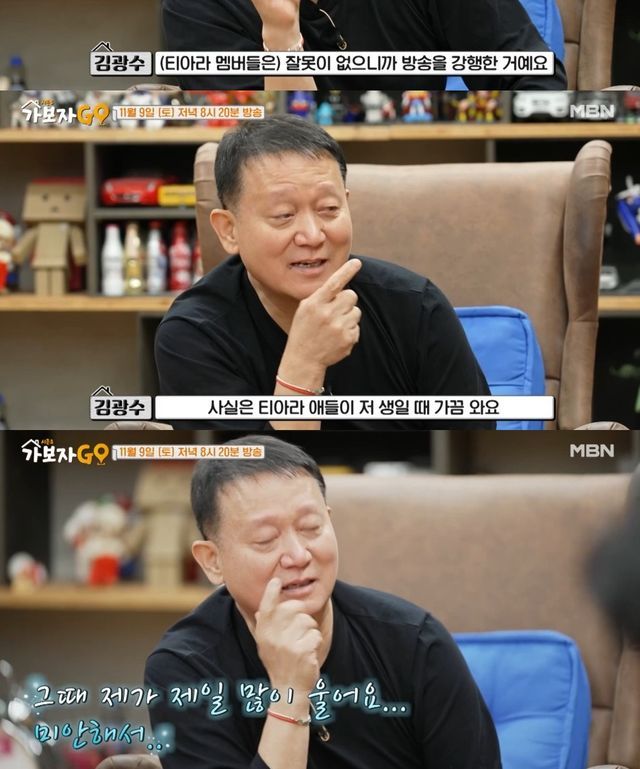 이에 김광수는 "티아라 애들이 제 생일 때 가끔 온다. 그때 최고로 많이 운다. 미안해서. 내가 그때 조금만 참을 걸. 기사 내면 안된다고 했는데 내겠다고 했다. (멤버들에게) 미안하다고"라며 눈물을 흘렸다.