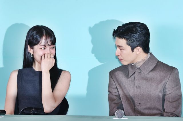 배우 노윤서와 홍경이 지난달 28일 오후 서울 강남구 메가박스 코엑스에서 열린 영화 '청설' 언론시사회 및 기자간담회에서 대화하고 있다. / 연합뉴스