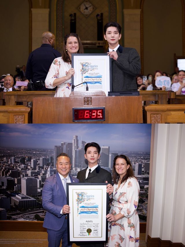LA시의회는 8일(이하 현지시간) 세븐틴 멤버 조슈아를 LA 시청으로 초청해 감사패를 수여했다. 이는 예술·문화·커뮤니티에 기여한 단체 및 개인에게 주어지는 것으로, LA시의회는 세븐틴이 공연과 더 시티 프로젝트로 도시를 널리 알린 점을 높게 평가했다.